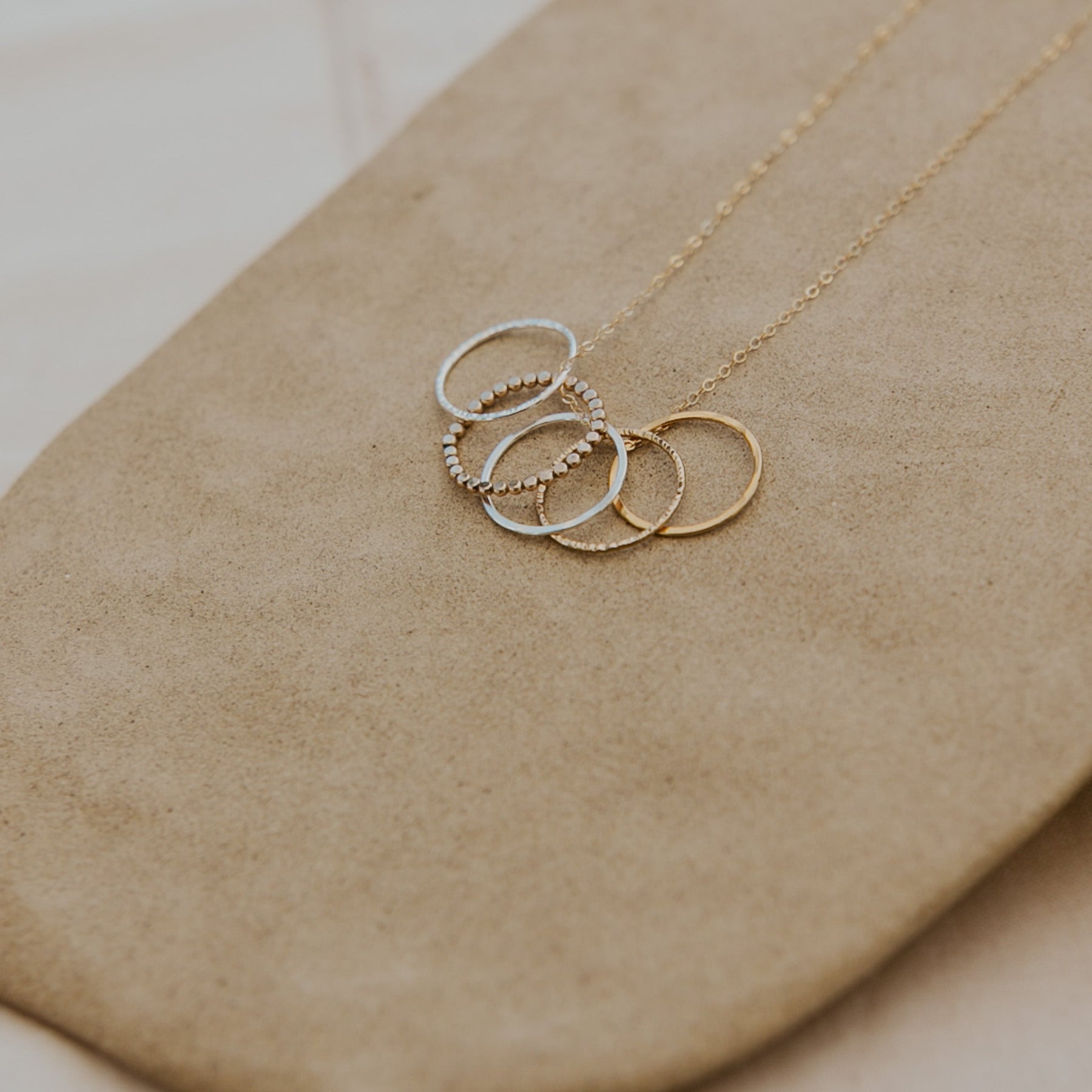 An anniversary, a birthday, your children or grandchildren, the Milestone Necklace commemorates life's special events in a beautifully unique way. Each mixed metal ring is hammered and polished for a subtle texture and shine. A perfect gift for yourself or someone special!