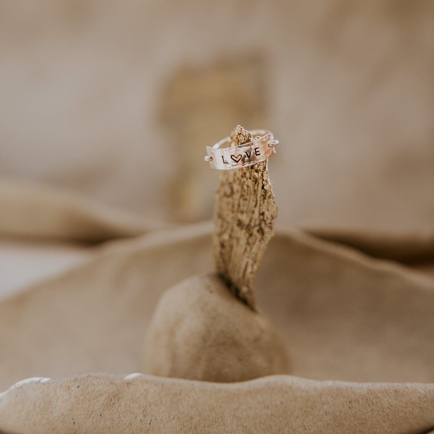 Gold ring with 'I ❤️ V E' text on a stone surface