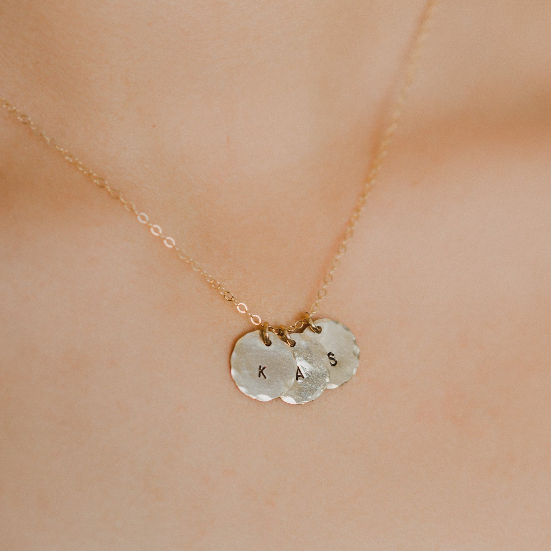 The Lori Disc Necklace is hand formed, hammered and polished for a subtle texture and high shine. Let's get personal! Add discs with your choice of initials to make this necklace even more special! Available in 14k Gold Filled or Sterling Silver to complement any style. Makes a great gift!