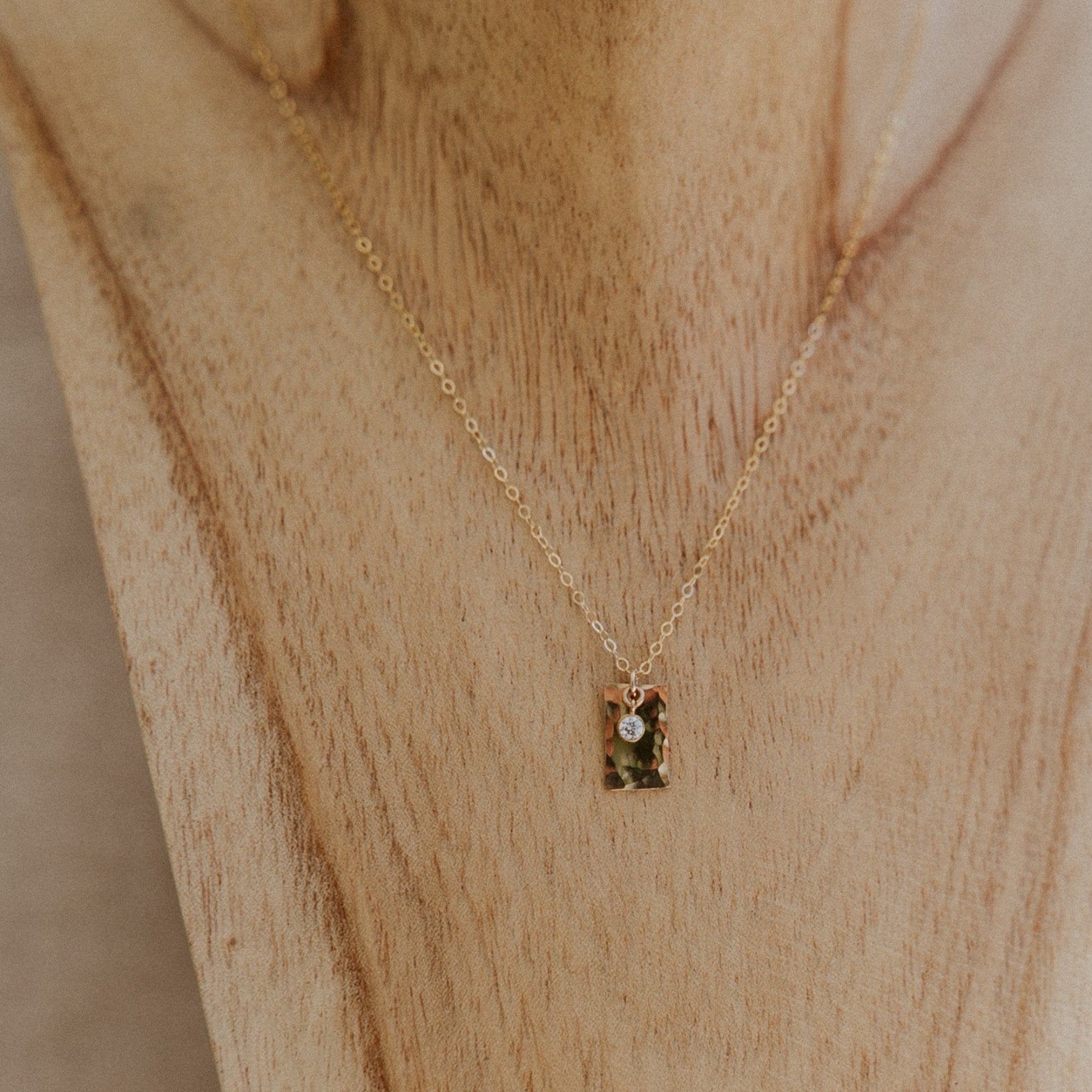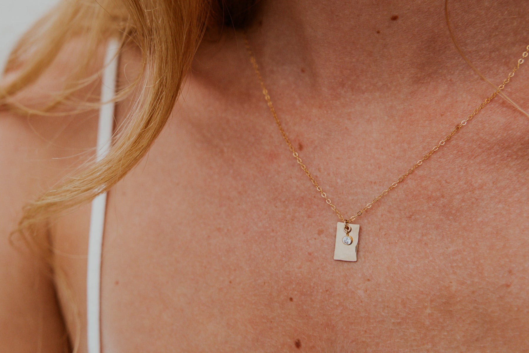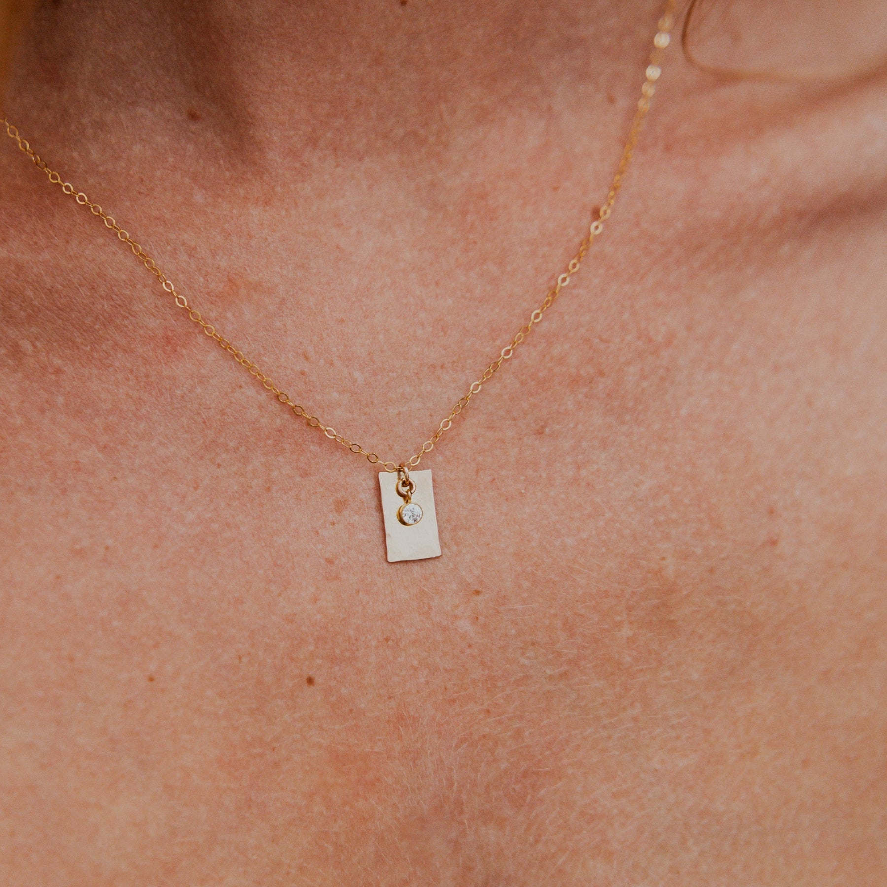 The Nora Necklace is meticulously crafted by hand, creating a polished texture and shining finish. A sparkling cubic zirconia enhances this essential piece from TLJ. Make it unique by adding an initial to the tag! Choose between 14k Gold Filled or Sterling Silver for a perfect match to your personal style. It makes a fantastic gift!