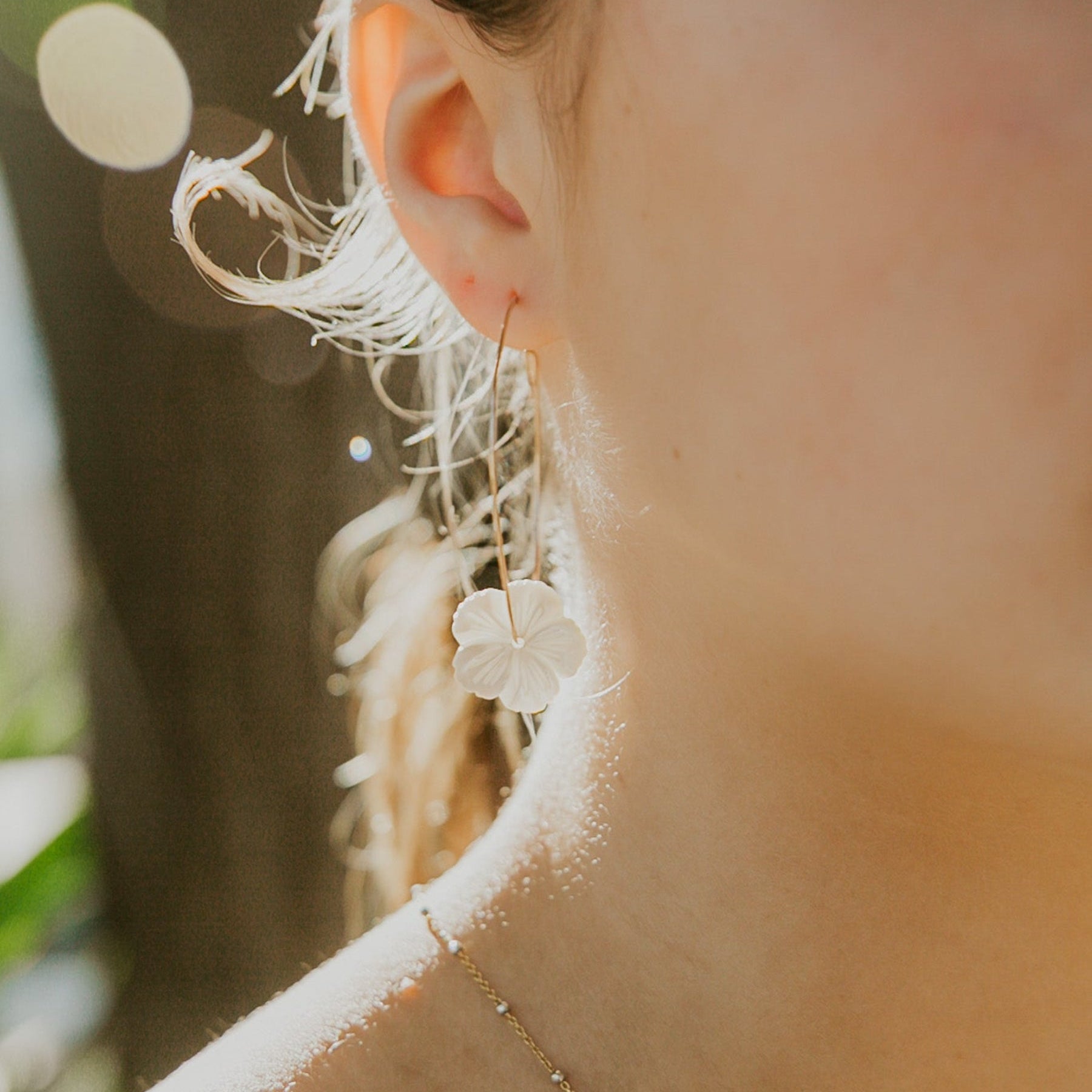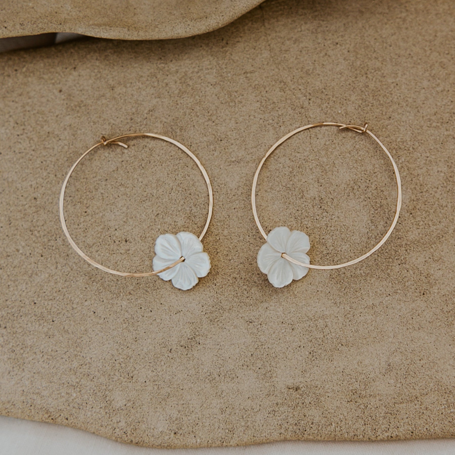 A delicate tribute to the Hawaiian islands, the Aloha Bloom hoops feature hand-carved mother of pearl flowers that sway gracefully on 1.75” hoops. Crafted in 14k gold-filled or sterling silver, they bring a tropical elegance to your ear game with their soft shimmer and dreamy vibe.