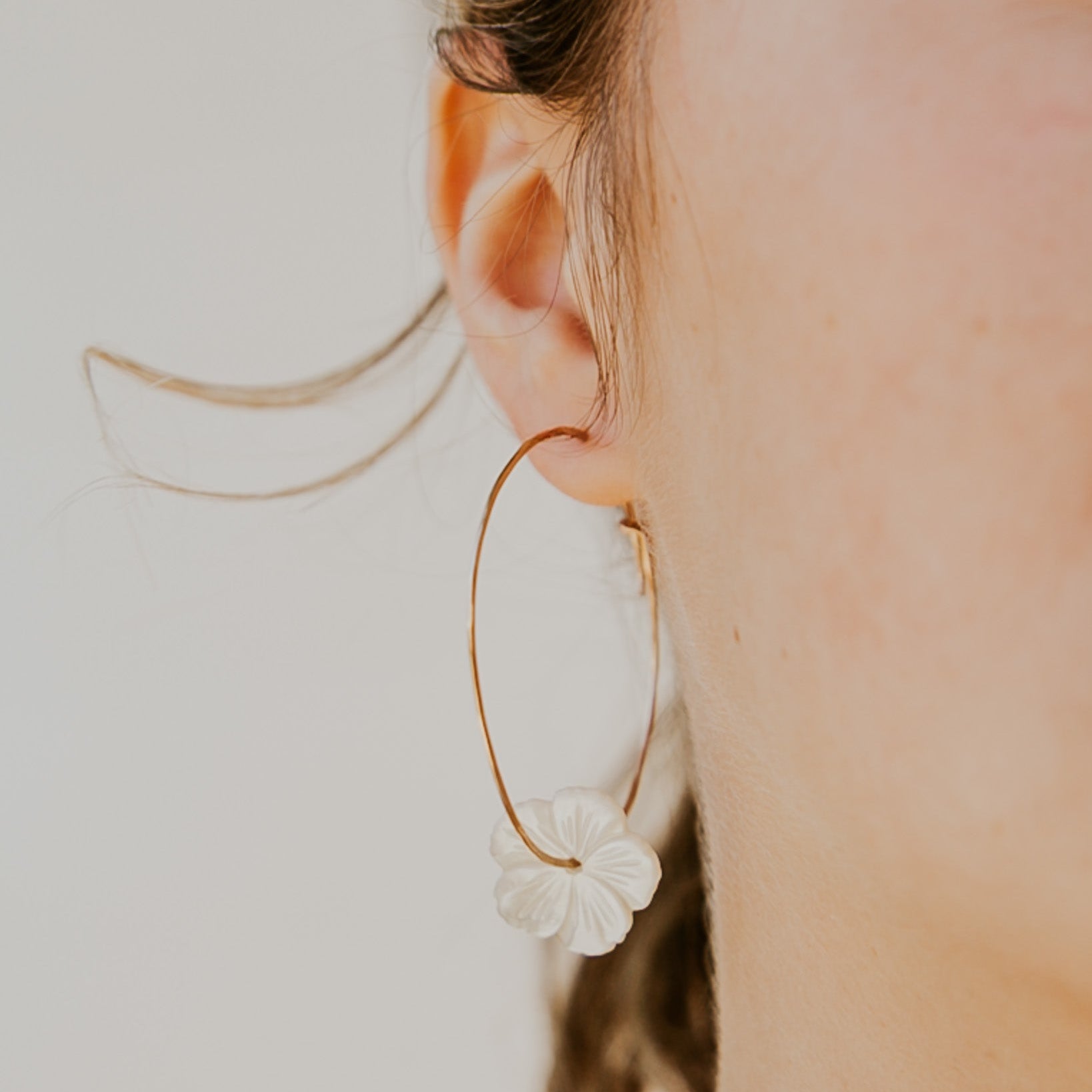A person wearing a pair of gold-filled earrings with hand-carved mother of pearl floral charms on 1.75 inch hoops.