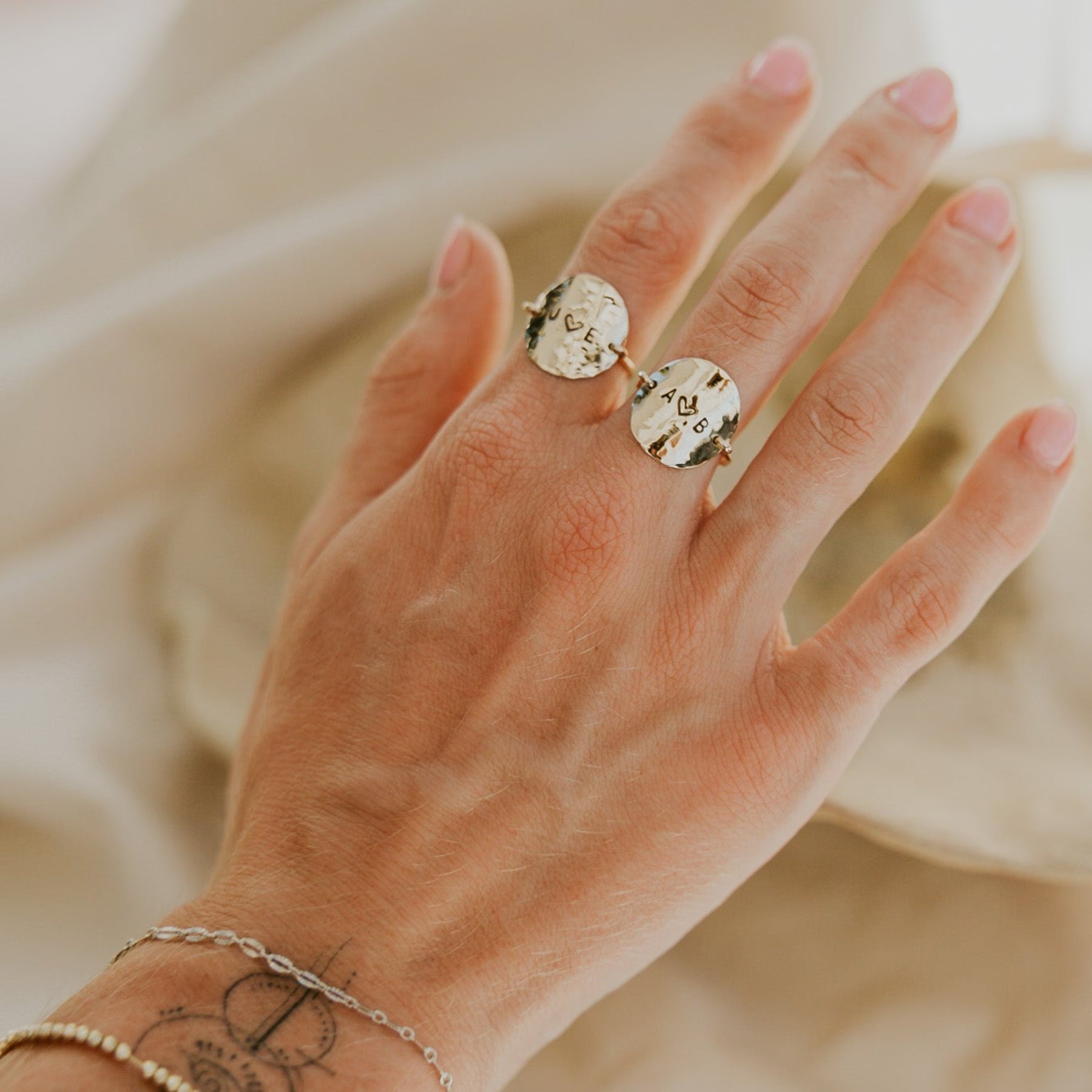 Silver disc rings on a textured beige surface