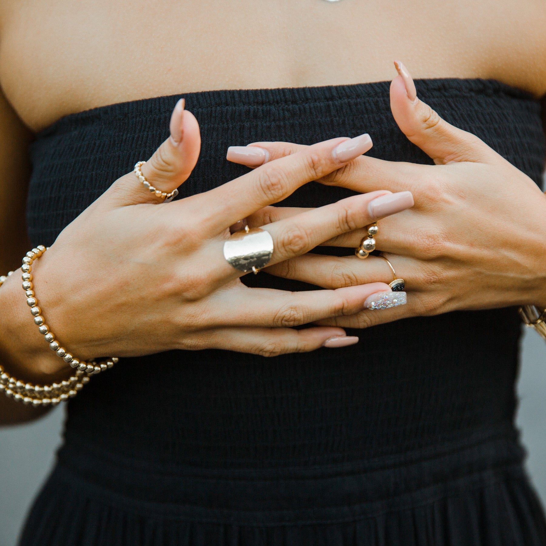 Close-up of a person's hands with rings and bracelets, wearing a black strapless top.