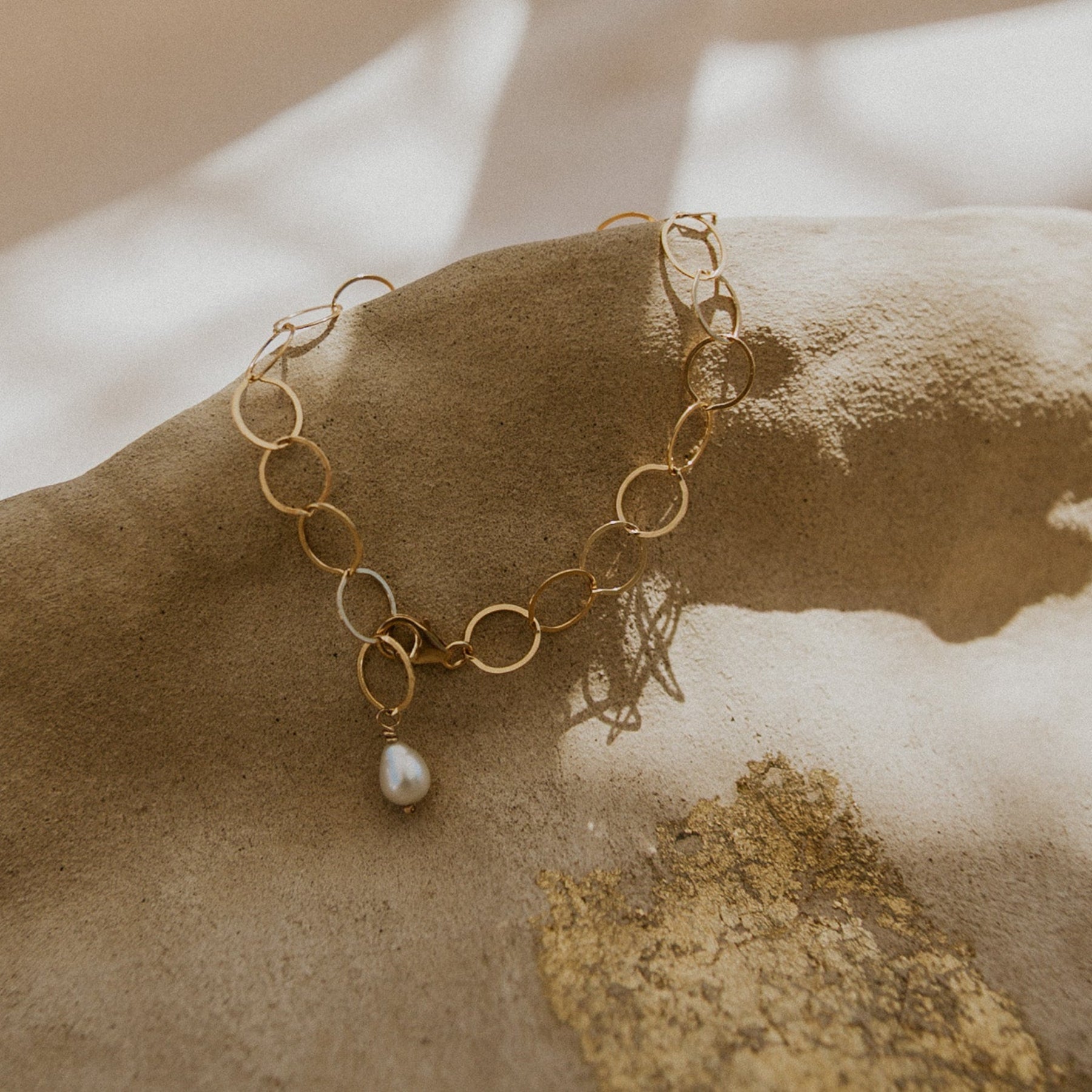 The Pearl Sue Bracelet is beautifully crafted to add chic elegance to any outfit. Featuring unique gold circles with a single, stunning pearl charm, perfectly combining luxury with subtle sophistication.