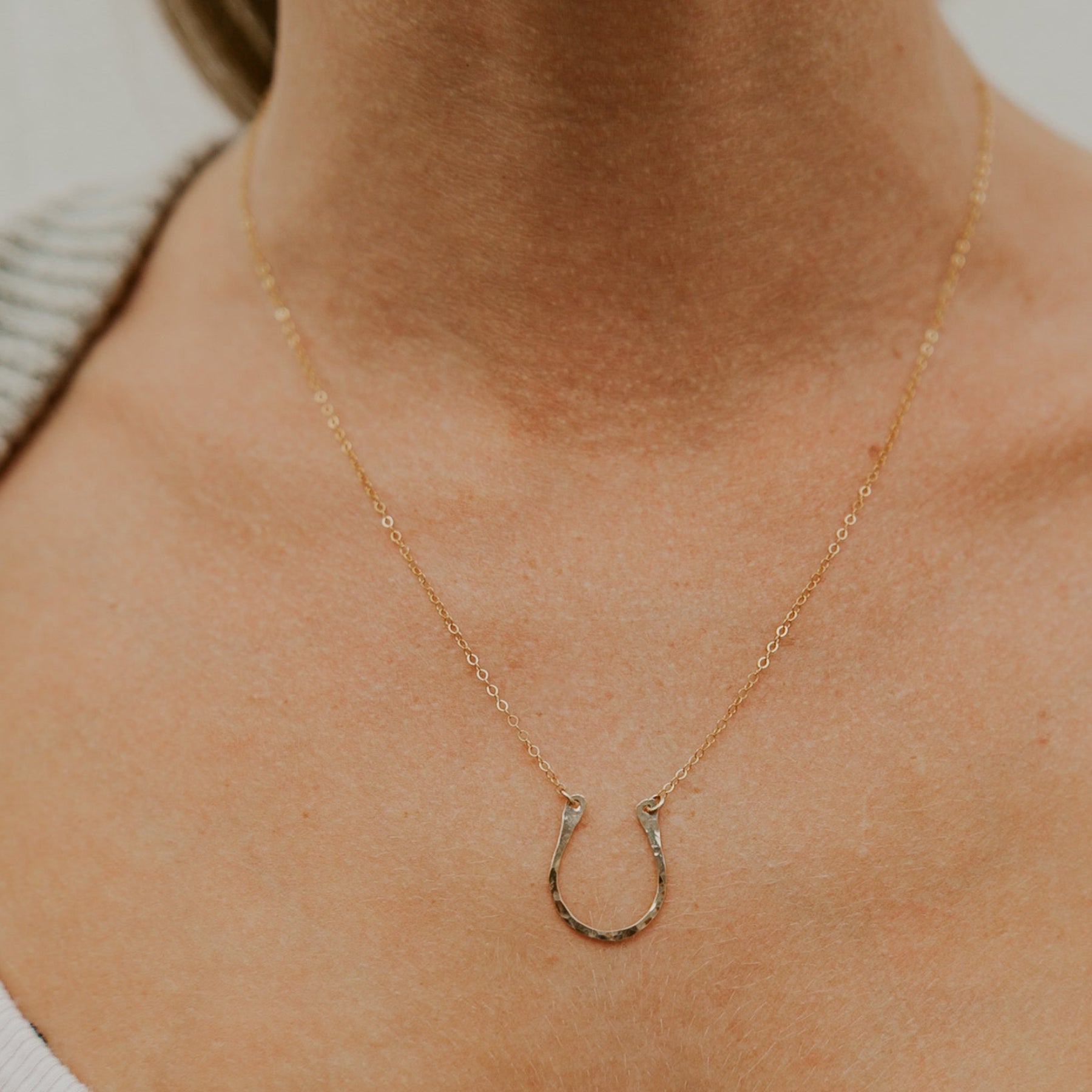 The Horseshoe Necklace is hand cut, hammered and polished for a beautiful texture and finish. Available in 14k Gold Filled or Sterling Silver to complement any style. Perfect for layering!