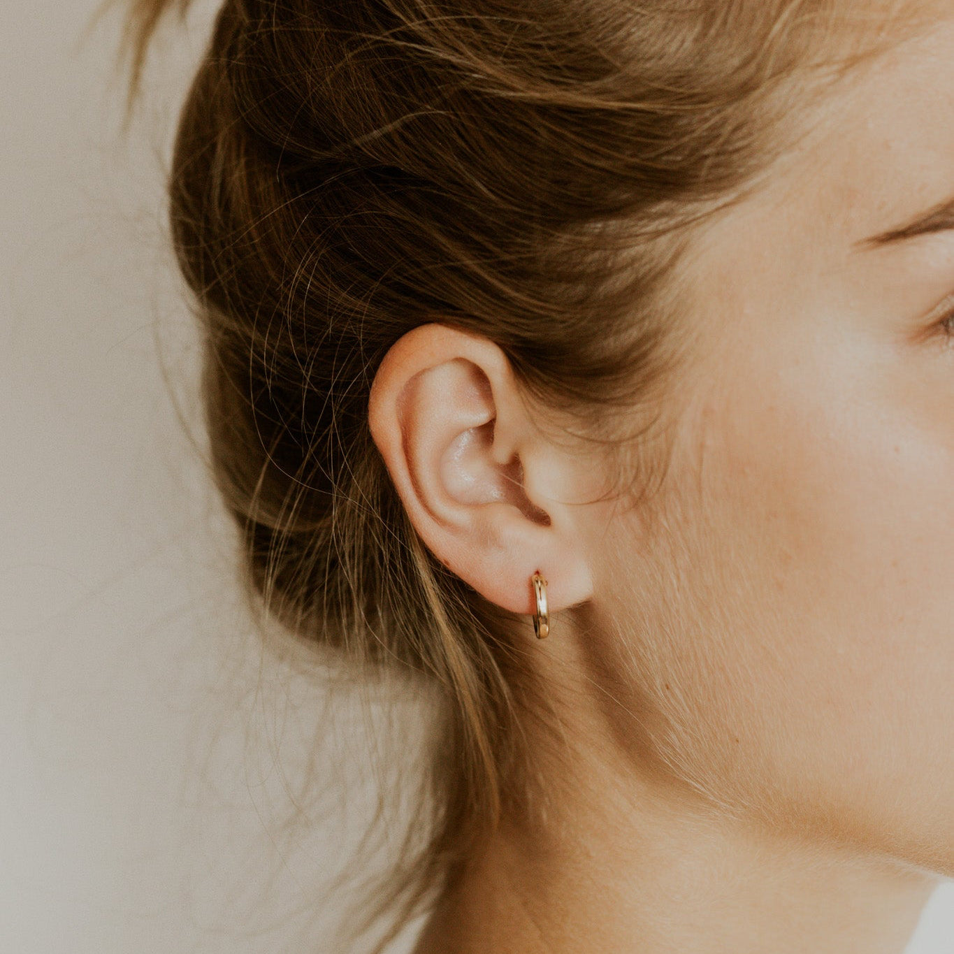 Close-up of a person wearing gold hoop earrings with a blurred background