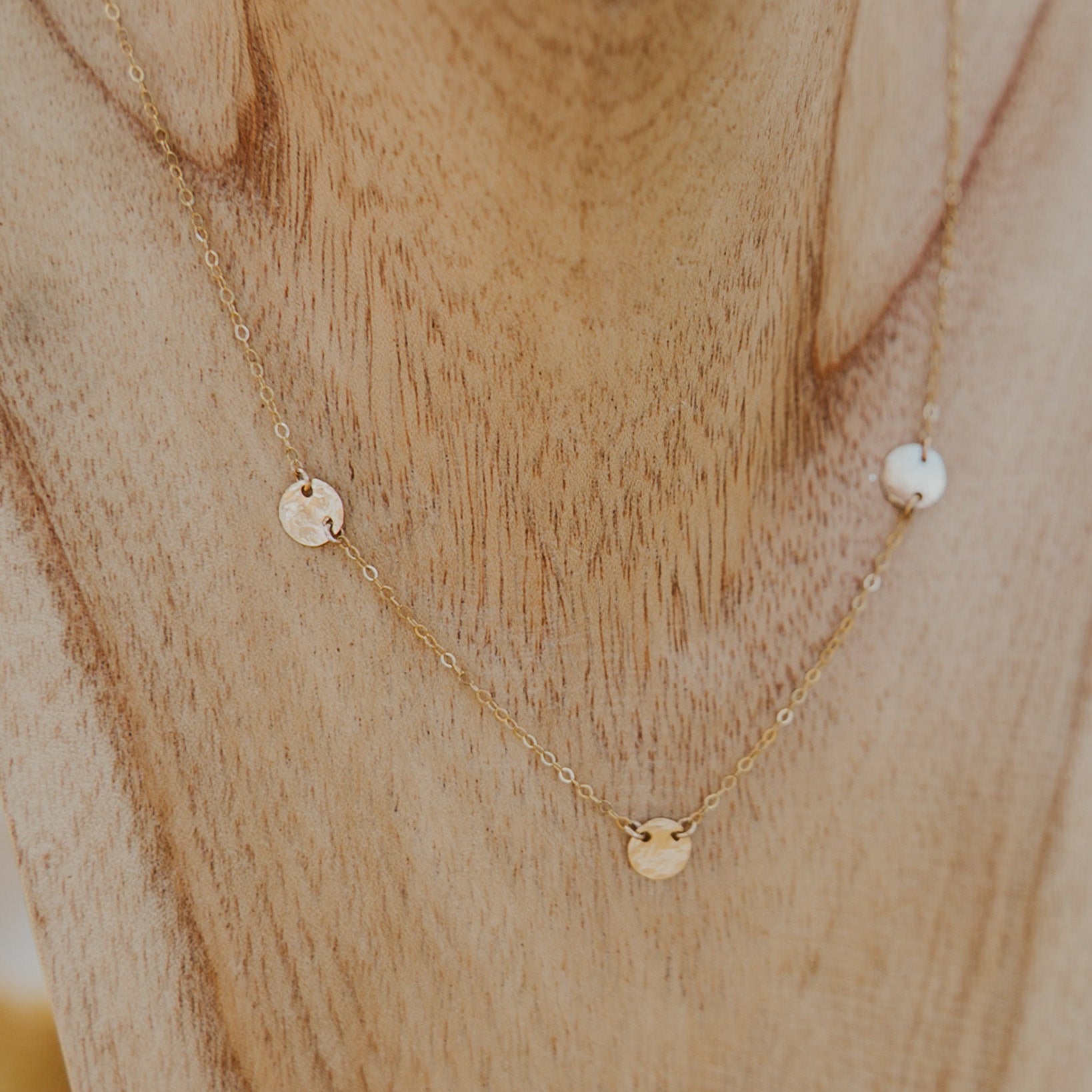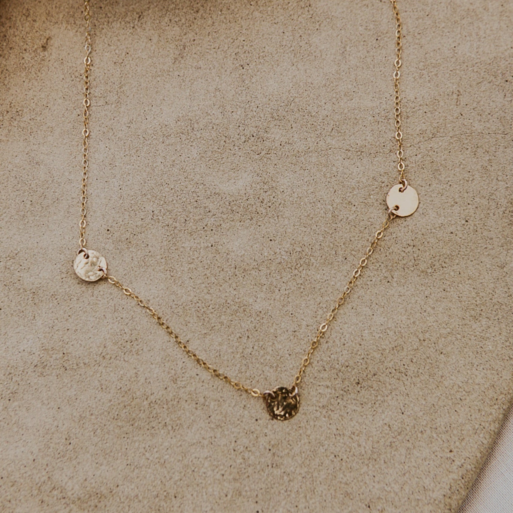 3 gold hammered textured discs connected on delicate fine14k gold fill chain